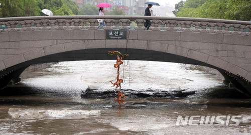 【서울=뉴시스】 추상철 기자 = 폭우가 이틀째 내린 17일 오전 서울 종로구 청계천에서 부처님오신날을 맞이해 설치된 원숭이 조형물이 물에 잠겨 있다. 2018.05.17.