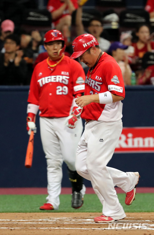 【서울=뉴시스】박주성 기자 = 17일 오후 서울 고척스카이돔에서 열린 2018 KBO 리그 KIA 타이거즈 대 넥센 히어로즈의 경기, 2회초 노아웃 주자 2, 3루 KIA 나지완 타석 때 넥센 포수 박동원이 볼을 놓치자 3루에 있던 주자 최형우가 홈을 밟고 있다. 2018.05.17.