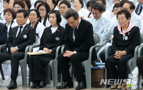 【광주=뉴시스】김선웅 기자 = 제38주년 5.18 광주민주화운동 기념일인 18일 오전 광주 북구 국립 5.18 민주묘지에서 열린 기념식에서 이낙연 국무총리가 슬픈 감정을 추스리고 있다. 2018.05.18.