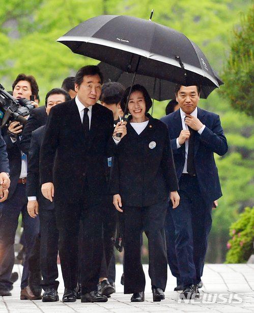 【광주=뉴시스】류형근 기자 = 이낙연 국무총리와 피우진 국가보훈처장이 18일 오전 광주 북구 운정동 국립5·18민주묘지에서 열린 '오월 광주, 정의를 세우다' 주제의 5·18민주화운동 38주기 기념식에 참석하고 있는 가운데 이 총리가 우산을 들고 피 처장을 씌워주고 있다. 2018.05.18.
