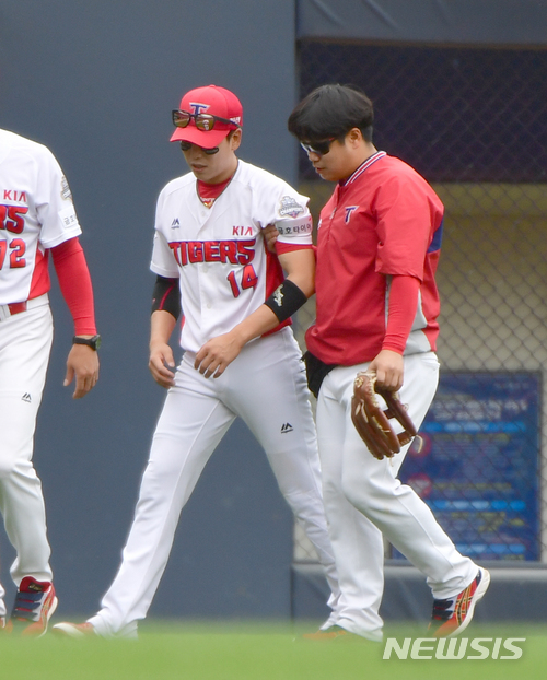 【광주=뉴시스】류형근 기자 = 20일 오후 광주 북구 광주-기아챔피언스필드에서 열린 2018프로야구 KIA 타이거즈 대 SK 와이번스의 경기, 2회초 1사에서 KIA 좌익수 유재신이 SK 5번타자 정의윤을 타구를 잡다 부상을 당해 교체되고 있다. 2018.05.20.