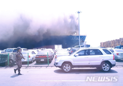 불이 난 화물선에는 수출용 중고차량 200여대가 실려 있는 것으로 전해졌고, 현재까지 진화작업이 계속되고 있다. 2018.05.21. (사진=독자 제공)