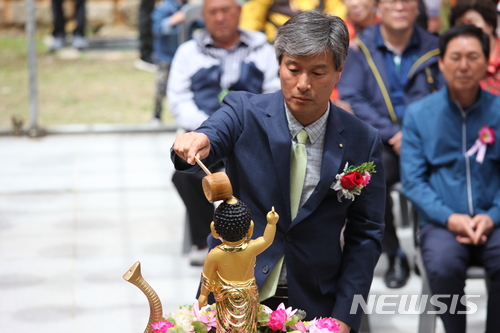 【정선=뉴시스】김태식 기자 = 22일 부처님 오신날을 맞아 강원 정선군 정암사에서 봉축법요식이 열리고 있는 가운데 위청준 KBS강릉방송국장이 부처님을 씻겨 드리고 있다. 2018.05.22.