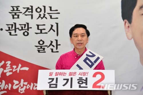 【울산=뉴시스】안정섭 기자 = 28일 자유한국당 김기현 울산시장 후보가 울산시의회 프레스센터에서 기자회견을 열고 정치후원금 편법 수수 의혹과 관련해 자신의 입장을 밝히고 있다. 2018.05.28.