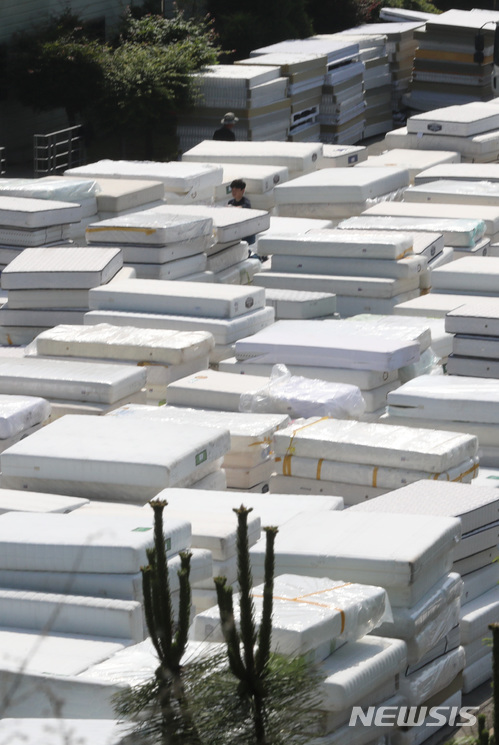 【천안=뉴시스】강종민 기자 = 방사능 물질 `라돈`이 검출돼 사회적 파장을 일으킨 대진침대 매트리스가 수거중인 가운데 28일 오전 천안시 서북구 대진침대 본사 앞마당에 수거된 매트리스가 가득 쌓여 있다. 2018.05.28.