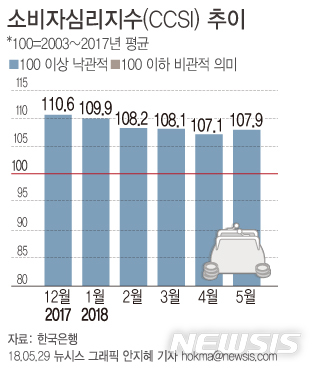 【서울=뉴시스】안지혜 기자 = 한국은행이 29일 발표한 '2018년 5월 소비자동향조사'에 따르면 이달 소비자심리지수는 107.9로 전월보다 0.8포인트 상승했다.