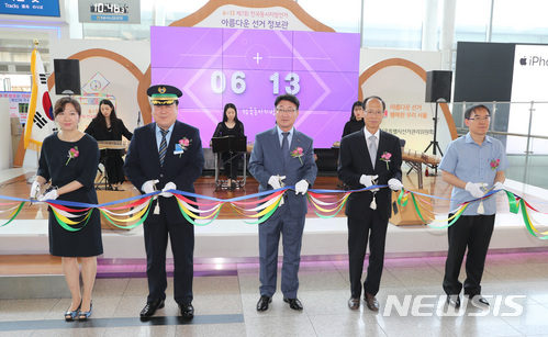 【서울=뉴시스】전진환 기자 = 6·13 지방선거를 앞두고 아름다운 선거 정보관 개관식이 열린 31일 오전 서울역 대합실에서 참석자들이 테이프 컷팅을 하고 있다.