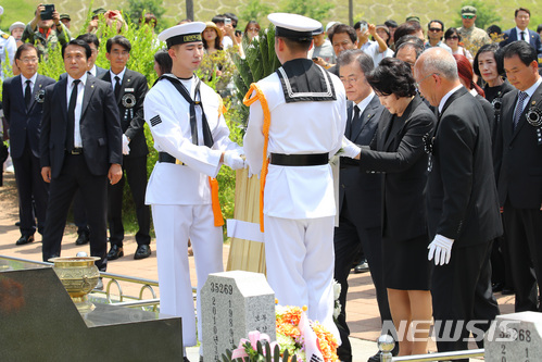 【대전=뉴시스】전신 기자 = 문재인 대통령이 부인 김정숙 여사와 6일 오전 제63회 현충일을 맞아 국립대전현충원 천안함 46용사 묘역을 찾아 헌화하고 있다. 2018.06.06.