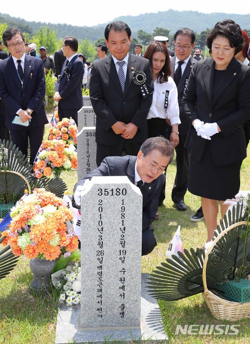 【대전=뉴시스】전신 기자 = 문재인 대통령이 6일 국립대전현충원에서 열린 제63회 현충일 추념식을 마치고 천안함 46용사 묘역을 찾아 고 박경수 상사의 묘비를 어루만지고 있다. 2018.06.06.
