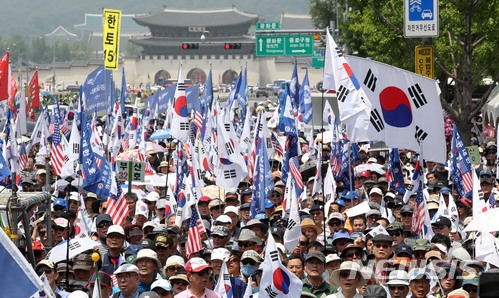 【서울=뉴시스】임태훈 기자 = 6일 오후 서울 종로구 교보빌딩 앞에서 열린 '자유민주주의 수호 국민대회'에서 보수단체 회원들이 태극기와 성조기를 들고, 애국가를 부르고 있다. 2018.06.06.