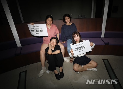 【서울=뉴시스】임태훈 기자 = 5일 오후 서울 동작구 대방동 서울여성플라자 NGO돋움센터에서 여성단체 '불꽃페미액션' 회원 선물(왼쪽 위부터 시계방향으로), 해나, 서윤, 검은 씨가 뉴시스와 인터뷰에 앞서 포즈를 취하고 있다. 2018.06.07.