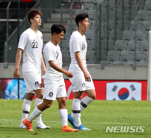 【인스브루크(오스트리아)=뉴시스】고범준 기자 = 7일 오후(현지시간)오스트리아 인스브루크 티볼리노이 스타디움에서 열린 2018 러시아월드컵 대비 대한민국-볼리비아의 평가전 경기, 0-0으로 무승부를 기록한 한국 손흥민, 이승우, 기성용을 비롯한 선수들이 아쉬운듯 그라운드를 빠져나가고 있다.