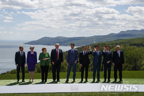 【라 말베=AP/뉴시스】8일(현지시간) 주요7개국 정상회의 정상회의는 캐나다 퀘벡주 북부 샤를부아 라 말베에서 개막한 가운데 정상들이 단체 사진을 찍고 있다. 이번 정상회의는 8~9일 이틀 간 개최된다. 2018.06.09