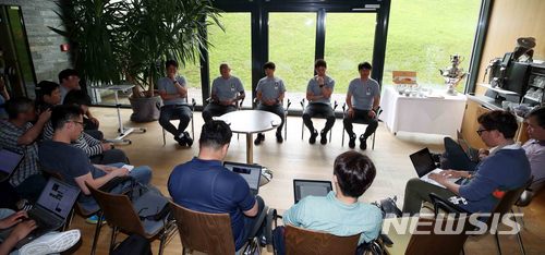 【레오강(오스트리아)=뉴시스】고범준 기자 = 8일(현지시간) 오후 오스트리아 레오강 크랄러호프 호텔에서 열린 2018 러시아월드컵 한국 대표팀 코칭스텝 간담회에서 이재홍 피지컬코치가 취재진 질문에 답변하고 있다. (왼쪽부터)김해운 GK코치, 차두리 코치, 이재홍 피지컬코치, 김남일 코치, 전경준 코치.