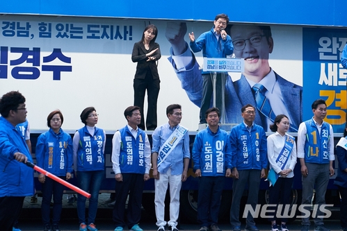 【창원=뉴시스】 홍정명 기자 = 지난 9일 저녁 경남 양산시 이마트 양산점 앞에서 진행된 거리 유세에서 김경수 더불어민주당 경남도지사 후보가 연설하고 있다.2018.06.10.(사진=김경수 후보 캠프 제공)