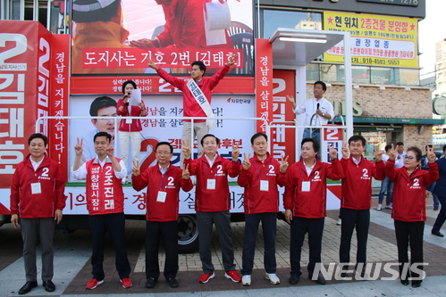 【창원=뉴시스】 홍정명 기자 = 지난 9일 오후 경남 창원시 성산구 상남동에서 김태호 자유한국당 경남도지사 후보가 거리 유세를 하고 있다.2018.06.10.(사진=김태호 후보 캠프 제공)