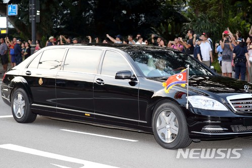 【싱가포르=뉴시스】조성봉 기자 = 북미정상회담을 이틀 앞둔 10일 오후 김정은 북한 국무위원회 위원장이 숙소인 세인트 리지스 호텔에서 출발해 대통령궁인 이스타나로 향하는 모습을 시민들이 스마트폰으로 찍고 있다. 2018.06.10.