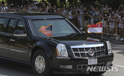 【싱가포르=AP/뉴시스】 도널드 트럼프 미국 대통령이 탄 전용차가 11일 싱가포르 대통령궁 이스타나로 향하고 있다. 전용차는 '캐딜락 원' 또는 '비스트(짐승이란 뜻)'란 별명을 가지고 있다. 2018.06.11