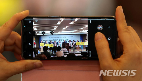 【서울=뉴시스】추상철 기자 = 한국어린이집총연합회 서울특별시어린이집연합회가 11일 오전 서울 중구 프레스센터에서 '보육교사 휴게시간 보장을 위한 정부대책 마련'을 촉구하는 기자회견을 열었다. 사진은 참가자가 기자회견 모습을 휴대폰 카메라에 담고 있다. 2018.06.11.