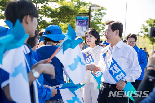 【파주=뉴시스】이경환 기자 = 12일 오전 더불어민주당 이재명 경기도지사 후보가 아내 김혜경씨와 파주시 임진각을 찾아 '평화선언'을 발표했다. 이 자리에는 같은 당 이재준 고양시장 후보와 최종환 파주시장 후보 등이 참석했다. 2018.06.12.(사진=이재명 캠프 제공)