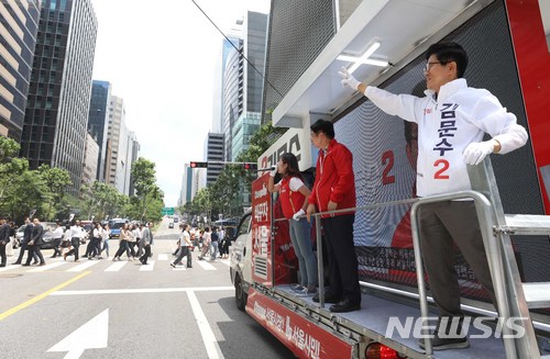【서울=뉴시스】고승민 기자 = 제7회 전국동시지방선거 및 국회의원 재보궐선거를 하루 앞둔 12일 오후 자유한국당 김문수 서울시장 후보가 서울 강남역 사거리에서 유세를 마친 뒤 선릉역 방향으로 차량유세를 하고 있다. 2018.06.12.