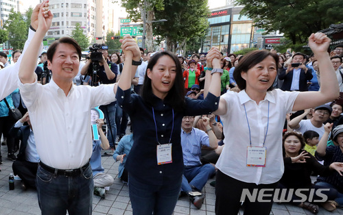 【서울=뉴시스】박영태 기자 = 안철수 바른미래당 서울시장 후보가 6.13 전국동시지방선거 마지막 유세날인 12일 오후 서울 종로구 탑골공원 앞에서 진행된 집중유세에서 부인인 김미경 교수, 딸 안설희 씨와 함께 손을 잡고 지지를 호소하고 있다. 2018.06.12.