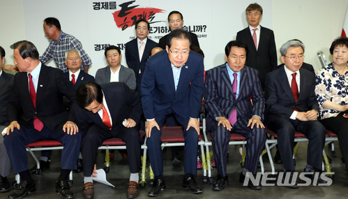 【서울=뉴시스】박영태 기자 = 13일 오후 서울 영등포구 여의도 자유한국당 당사에서 홍준표 대표와 김성태 원대대표 등 당직자들이 6.13 전국동시지방선거 출구조사 발표에서 자유한국당이 완패로 발표되자 자리를 떠나고 있다. 2018.06.13.