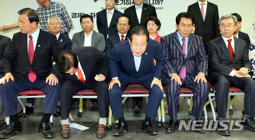 【서울=뉴시스】박영태 기자 = 13일 오후 서울 영등포구 여의도 자유한국당 당사에서 홍준표 대표와 김성태 원대대표 등 당직자들이 6.13 전국동시지방선거 출구조사 발표에서 자유한국당이 완패로 발표되자 자리를 떠나고 있다. 2018.06.13.