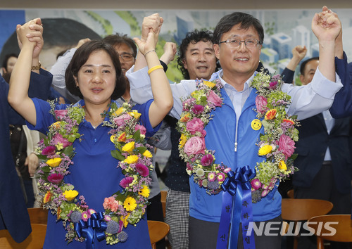 【서울=뉴시스】최동준 기자 = 김성환 더불어민주당 노원구병 후보가 13일 서울 노원구 선거 캠프에서 당선이 확실시되자 부인 박정옥 여사, 지지자들과 환호하고 있다. 2018.06.13.