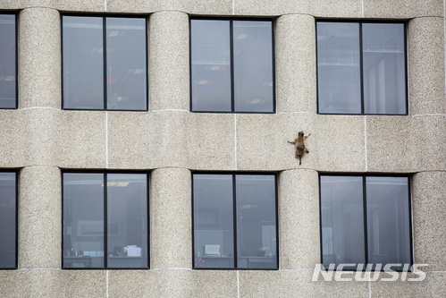 【세인트폴(미 미네소타주)=AP/뉴시스】미 미네소타주 세인트폴에서 12일(현지시간) 야생 라쿤 한마리가 25층짜리 UBS 플라자 외벽을 기어오르고 있다. 이 라쿤은 13일 새벽 25층 꼭대기 옥상에 도착하는데 성공했고, 이후 동물보호 당국에 생포됐다가 야생으로 돌아갔다. 2018.6.14