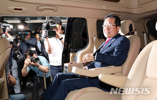 【서울=뉴시스】박영태 기자 = 자유한국당 홍준표 대표가 14일 오후 서울 여의도 당사에서 사퇴 의사를 밝힌 뒤 당사를 떠나고 있다. 2018.06.14.