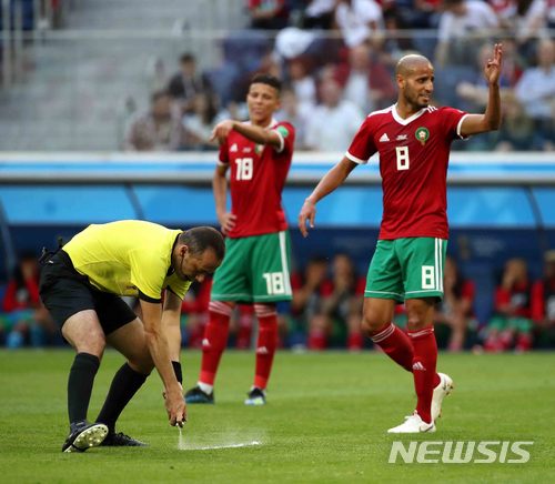 【상트페테르부르크(러시아)=뉴시스】고범준 기자 = 15일(현지시간) 러시아 상트페테르부르크 스타디움에서 열린 2018 러시아월드컵 이란-모로코 경기, 심판이 프리킥 위치를 표시하기 위해 베니싱 스프레이를 뿌리고 있다. 2018.06.16.
