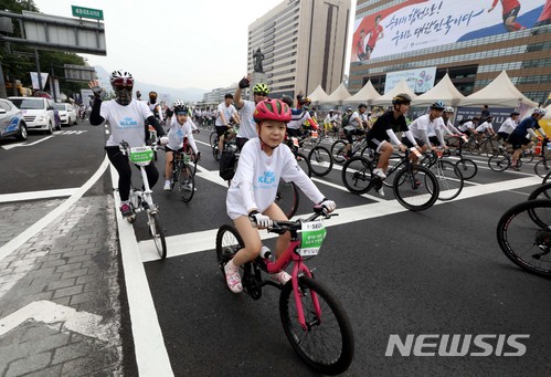 【서울=뉴시스】조성봉 기자 = 17일 오전 서울 종로구 광화문 광장에서 열린 2018 서울 자전거대행진에서 참가자들이 힘찬 출발을 하고 있다.