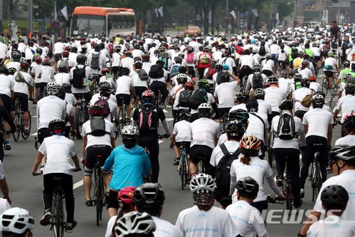 중앙일보, jtbc, 위스타트(WESTART)가 공동주최하고, 서울시가 후원한 이번 자전거 대행진은 광화문 광장을 출발해 강변북로를 거쳐 월드컵공원으로 들어오는 21km 코스로 속도를 겨루지 않고 상급?중급?초급으로 그룹을 나눠 자신의 속도에 맞춰 함께 달리는 자전거 주행 행사다. 2018.06.17.