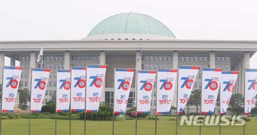 【서울=뉴시스】고승민 기자 = 17일 오전 서울 여의도 국회의사당 앞 광장에 '제헌, 국회개원 70주년' 기념 깃발이 설치돼 있다. 2018.06.17.