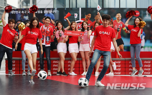 【서울=뉴시스】김진아 기자 = 2018 월드컵 첫 경기 스웨덴전을 하루 앞둔 17일 서울 삼성동 코엑스 동편광장 팬파크빌리지 내 ‘코카-콜라 2018 FIFA 러시아 월드컵 체험공간’에서 모델들이 태극전사들의 짜릿한 승리를 응원하고 있다.