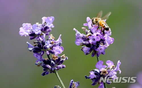 【서귀포=뉴시스】우장호 기자 = 17일 오후 제주 서귀포시 표선면 번영로 인근 꽃밭에서 벌이 부지런히 라벤더꽃 사이를 분주히 오가며 꿀을 따고 있다. 2018.06.17.
