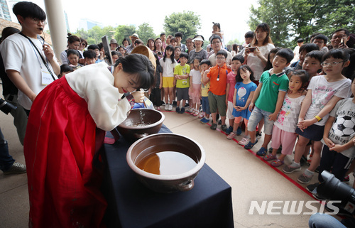 【서울=뉴시스】김진아 기자 = 단오(음력 5월5일)를 하루 앞둔 17일 서울 송파구 한성백제박물관에서 열린 단오 박물관 나들이 행사에서 선생님이 청포물에 머리감기 체험을 하고 있다. 2018.06.17.