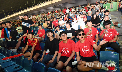 【광주=뉴시스】신대희 기자 = 2018 러시아월드컵 F조 한국 대 스웨덴 조별리그 1차전이 열리는 18일 오후 광주 서구 월드컵경기장에서 시민들이 페널티킥 선언이 번복된 판정에 안타까움을 드러내고 있다. 2018.06.18.