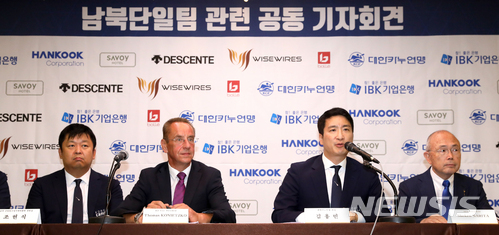 【서울=뉴시스】박진희 기자 = 조현식(왼쪽부터) 남북 단일팀구성특별위원회 위원장, 토마스 코니에츠코 국제카누연맹 부회장, 김용빈 대한카누연맹 회장, 나리타 쇼켄 아시아카누연맹 회장이 19일 오전 서울 중구 프레지던트 호텔에서 제18회 자카르타-팔렘방 아시안게임에서 남북 단일팀 구성 관련 공동 기자회견을 하고 있다.