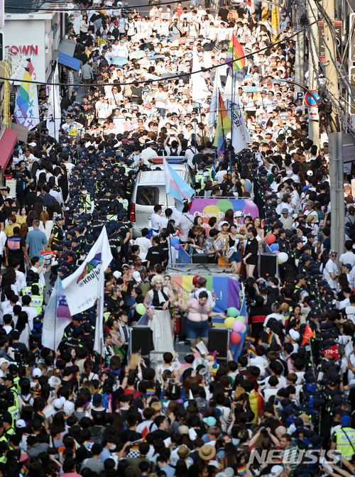 【대구=뉴시스】우종록 기자 = 제10회 대구퀴어문화축제가 열린 23일 오후 대구시 중구 동성로 대구백화점에서 거리행진을 앞둔 성 소수자 참석자들과 축제를 반대하는 종교단체가 대치하고 있다. 2018.06.23.