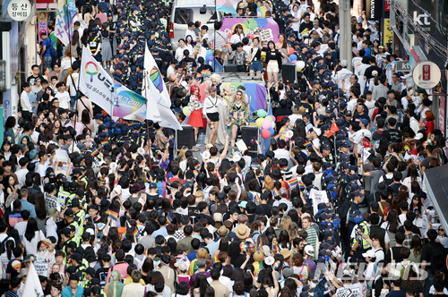 【대구=뉴시스】우종록 기자 = 제10회 대구퀴어문화축제가 열린 23일 오후 대구시 중구 동성로 대구백화점 앞 광장에서 성 소수자 참석자들이 거리행진을 준비하고 있다. 2018.06.23.
