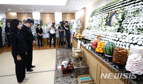 【서울=뉴시스】조성봉 기자 = 박지만 EG회장과 부인 서향희 변호사가 24일 오전 서울 송파구 서울아산병원에 마련된 故 김종필 전 국무총리의 빈소에 조문하고 있다. 2018.06.24.