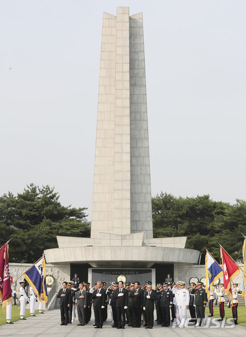 【서울=뉴시스】최진석 기자 = 송영무(앞줄 가운데) 국방부 장관이 6.25전쟁 68주년인 25일 서울 동작구 국립서울현충원을 찾아 현충탑에 참배, 국기에 대한 경례를 하고 있다. 2018.06.25.