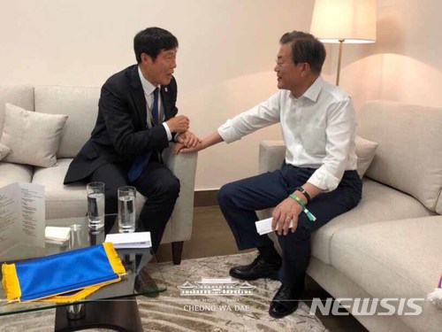 【서울=뉴시스】청와대가 25일 페이스북을 통해 <청와대 B컷 : 2박4일 러시아 국빈방문 이야기> 제목으로 러시아 순방 사진을 공개했다. 문재인 대통령과 차범근 전 감독이 러시아 월드컵 한국과 멕시코 경기 전 대화를 나누고 있다. 2018.06.25. (사진=청와대 제공)