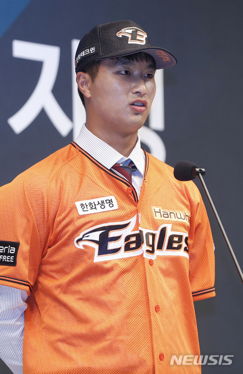 【서울=뉴시스】최동준 기자 = 25일 서울 중구 웨스틴조선호텔에서 열린 '2019 KBO 신인 1차 지명' 행사에서 한화 이글스에 1차 지명된 북일고 변우혁이 소감을 말하고 있다. 2018.06.25.