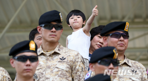 【인천=뉴시스】김선웅 기자 = 25일 오후 인천 계양구 국제평화지원단에서 열린 UAE 군사훈련협력단(아크부대) 14진 환송식에서 한 어린이가 파병 장병들을 바라보며 엄지를 치켜세우고 있다.