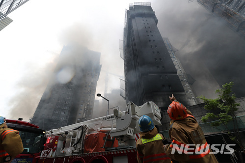 【세종=뉴시스】강종민 기자 = 26일 오후 세종시 새롬동 한 아파트 건설현장에서 화재가 발생, 소방대원들이 화재진압과 고립된 근로자 구조작전을 벌이고 있다. 2018.06.26.