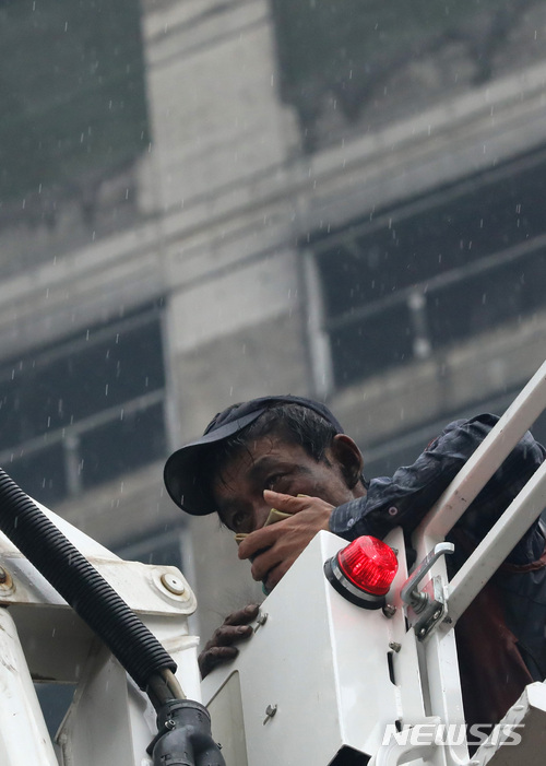 【세종=뉴시스】강종민 기자 = 26일 오후 세종시 새롬동 한 아파트 건설현장에서 화재가 발생, 소방대원들에 의해 고립됐다 구조된 근로자가 지상으로 내려오고 있다. 2018.06.26.