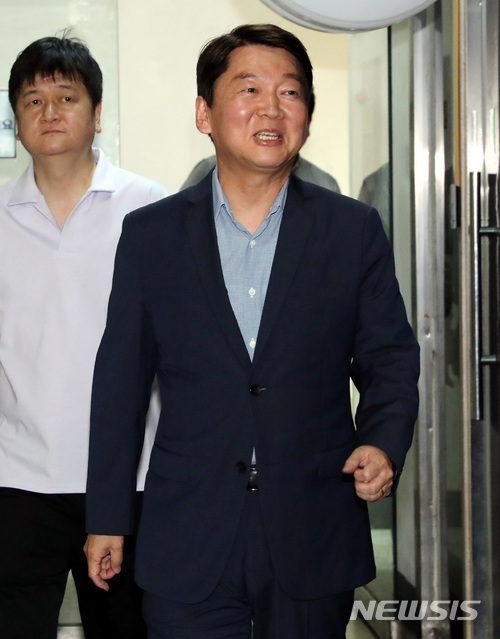 【서울=뉴시스】박영태 기자 = 안철수 바른미래당 전 서울시장 후보가 27일 서울 영등포구 여의도 한 식당에서 사무처 당직자들과 오찬을 위해 입장하고 있다. 2018.06.27.